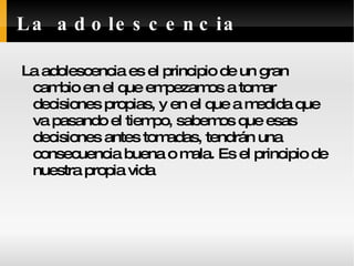 El documento discute los desafíos de la adolescencia, incluidas las decisiones que toman y sus consecuencias, y las enfermedades psicológicas que pueden surgir debido a los cambios y presiones de la etapa. Específicamente, destaca que la adolescencia es un período de transición hacia la independencia y la responsabilidad personal, y que los trastornos mentales son más comunes debido a los conflictos internos y externos asociados con la sociedad y las relaciones familiares.