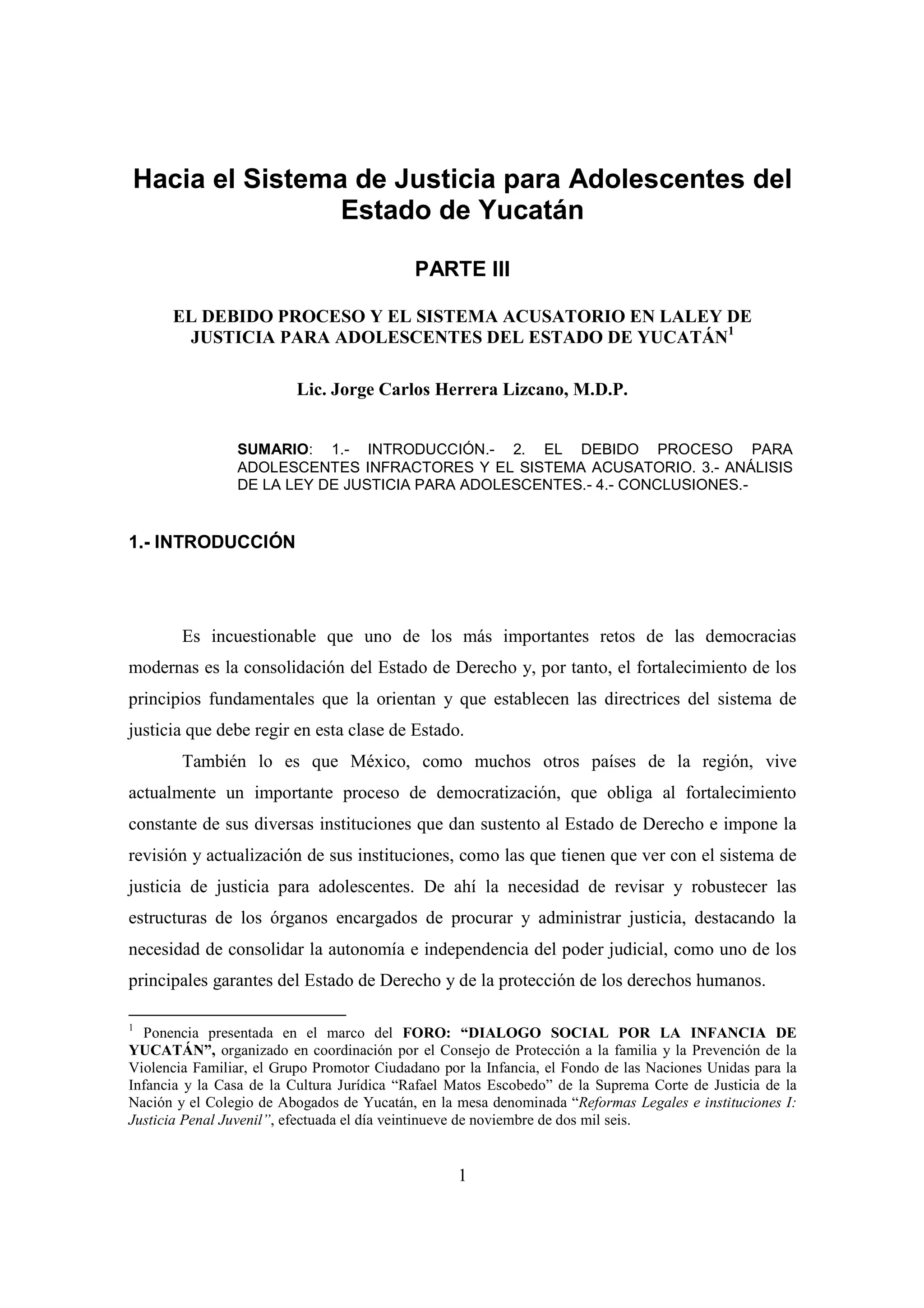 Este documento analiza la Ley de Justicia para Adolescentes del estado de Yucatán a la luz del debido proceso y el sistema acusatorio. Explica que la ley busca establecer un sistema que garantice plenamente los derechos de los adolescentes infractores, siguiendo los principios del debido proceso y un enfoque de corte acusatorio. Asimismo, analiza algunos de los principios y garantías que deben respetarse en el nuevo sistema de justicia para adolescentes de acuerdo a los estándares internacionales.