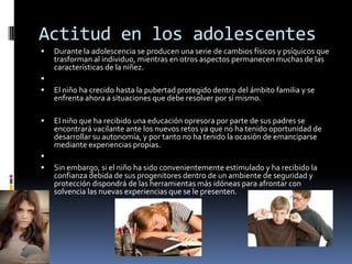 Este documento resume varios temas clave sobre la adolescencia. Describe los cambios físicos y psicológicos que ocurren durante esta etapa, incluyendo los cambios en el cuerpo de hombres y mujeres. También discute temas como el embarazo en la adolescencia, el aborto, el uso de drogas, los trastornos alimenticios y el abuso sexual. El documento provee información fundamental sobre los desafíos y experiencias comunes que enfrentan los adolescentes.