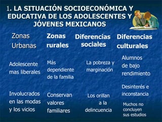 El documento describe varios factores sociales y culturales que ponen en riesgo a los adolescentes mexicanos, incluyendo su situación socioeconómica y educativa, el entorno familiar disfuncional, la influencia negativa de los medios de comunicación y la cultura juvenil, un ambiente escolar poco favorable, y la combinación de múltiples factores de riesgo. La escuela enfrenta el reto de prevenir y reducir estos riesgos promoviendo valores, innovando los métodos de enseñanza, y colaborando con la comunidad educativa.