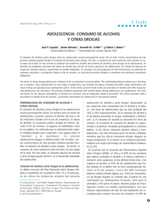 Este documento discute las tendencias actuales del consumo de alcohol y otras drogas entre adolescentes en España. Señala que el alcohol y el tabaco son las sustancias más consumidas por los adolescentes, y que el consumo de alcohol suele concentrarse los fines de semana y estar vinculado a contextos lúdicos. También analiza los problemas derivados del abuso de alcohol durante la adolescencia, como la intoxicación aguda, problemas escolares y legales, accidentes de tráfico, y un mayor riesgo de consumo de otras drogas. Finalmente, revisa los factores de riesgo del consum