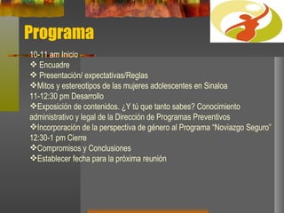 Este documento presenta un taller de sensibilización e integración de género en el programa "Noviazgo Seguro" de la Secretaría de Seguridad Pública. El taller cubre temas como mitos y estereotipos sobre mujeres adolescentes, la perspectiva de género en intervenciones comunitarias, y la Ley de Seguridad Pública de Sinaloa. El objetivo es discutir cómo el programa puede favorecer una red de apoyo psicosocial que incluya a las mujeres.