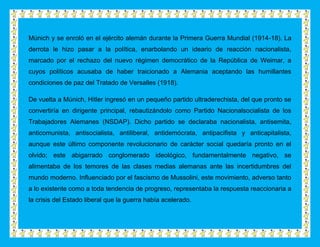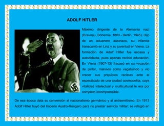Adolf Hitler fue el líder de la Alemania nazi desde 1933 hasta 1945. Llevó a Alemania a la Segunda Guerra Mundial y perpetró el Holocausto, que resultó en el genocidio sistemático de millones de judíos europeos. Después de una serie de victorias militares iniciales, las fuerzas de Hitler fueron derrotadas en 1945. Derrotado y con su visión de dominio mundial fracasada, Hitler se suicidó en su búnker en Berlín cuando el Ejército Rojo se acercaba.