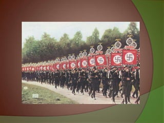 Este documento resume la vida y psicopatología de Adolf Hitler. Tuvo una infancia difícil con un padre violento y murió su madre a temprana edad. Sirvió con valentía en la Primera Guerra Mundial pero quedó resentido por la derrota alemana. Incursionó en la política con discursos populistas y se convirtió en canciller en 1933, estableciendo un régimen totalitario. Sufría delirios de persecución y grandeza que lo llevaron a iniciar la Segunda Guerra Mundial. Cuando los so