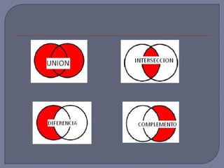 El documento presenta información sobre los conceptos básicos de teoría de conjuntos. Define qué es un conjunto y sus elementos. Explica los tipos de conjuntos (finitos, infinitos, vacíos, universales), formas de expresar conjuntos (extensión, comprensión) e introduce operaciones básicas como unión, intersección y diferencia.