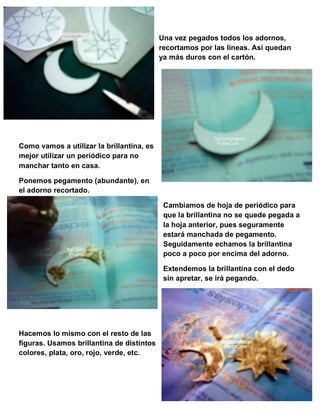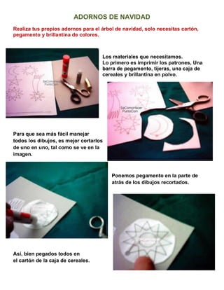 Este documento proporciona instrucciones para hacer adornos navideños caseros utilizando cartón, pegamento y brillantina. Los pasos incluyen imprimir patrones, cortar las figuras del cartón, pegarlas en una caja de cereal, aplicar pegamento a las figuras y espolvorear brillantina de diferentes colores, y finalmente colgar los adornos en el árbol de Navidad.