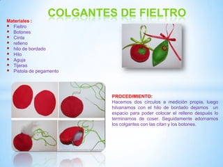 Este documento proporciona instrucciones para crear varios adornos navideños, incluidos un muñeco de nieve hecho de calcetines, colgantes de fieltro y una corona navideña hecha de palillos de madera. Los materiales necesarios incluyen calcetines, relleno, botones, fieltro, hilo, palillos de madera, cuentas y pintura. Las instrucciones detallan cómo cortar, coser y decorar los calcetines y fieltro, y cómo ensartar los palillos de madera y cuentas en una