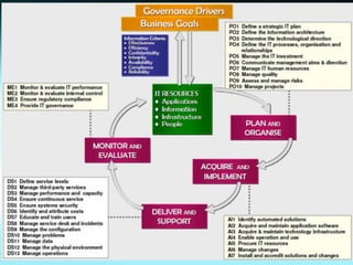 Este documento proporciona información sobre el proceso de Adquirir e Implementar según COBIT 4.0. Explica que este proceso se enfoca en identificar, desarrollar, adquirir, implementar e integrar soluciones TI para ejecutar la estrategia TI de la organización. Luego describe algunos objetivos clave como garantizar que las nuevas soluciones satisfagan las necesidades del negocio, se entreguen a tiempo y dentro del presupuesto, y funcionen adecuadamente una vez implementadas.