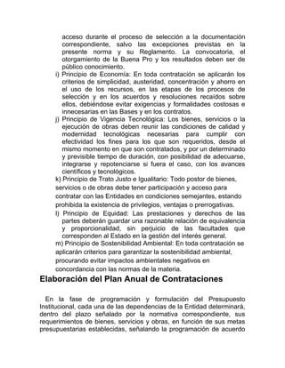 El documento establece los principios que rigen las contrataciones públicas como la promoción del desarrollo humano, la moralidad, la libre concurrencia, la imparcialidad, la razonabilidad, la eficiencia, la publicidad, la transparencia, la economía, la vigencia tecnológica, el trato justo e igualitario, la equidad y la sostenibilidad ambiental. También describe el proceso de elaboración del plan anual de contrataciones y los requisitos del expediente de contratación, incluyendo el valor referencial y