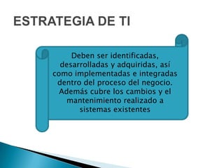 El documento habla sobre la importancia de identificar, desarrollar, adquirir, implementar y mantener sistemas para apoyar los procesos del negocio. También discute el uso de pistas de auditoría para cumplir objetivos de protección de datos y seguridad de la información, así como detectar eventos y problemas. Finalmente, presenta varias técnicas clave para garantizar la integridad, confidencialidad y disponibilidad de los datos.