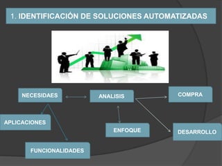Este documento describe los procesos clave de adquisición e implementación de tecnología. Estos incluyen la identificación de soluciones automatizadas, la adquisición y mantenimiento de software y hardware, el desarrollo y mantenimiento de procesos, la instalación y aceptación de sistemas, y la administración de cambios a través de procedimientos formales. El objetivo general es asegurar que la tecnología implementada cumpla con los requerimientos del negocio de manera eficiente y segura.
