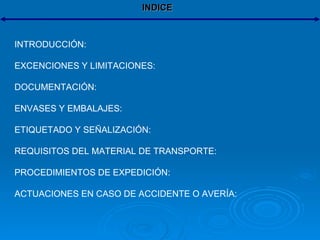 El documento proporciona información sobre los requisitos de seguridad para el transporte de mercancías peligrosas. Explica las exenciones y limitaciones, la documentación requerida como la carta de porte y las instrucciones escritas para el conductor, los requisitos para los envases y embalajes, y las acciones a tomar en caso de accidente o avería.