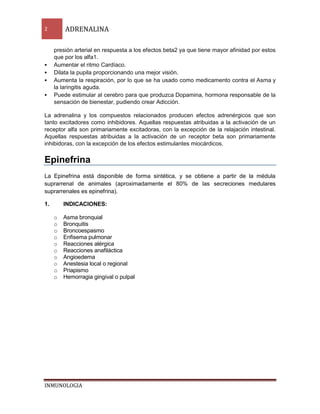 La adrenalina es una hormona y neurotransmisor producida por las glándulas suprarrenales que causa varios efectos fisiológicos como aumentar la glucosa en sangre, la tensión arterial y la frecuencia cardíaca. Se usa comúnmente para tratar el asma, las reacciones alérgicas graves y la parada cardíaca. La adrenalina actúa en los receptores alfa y beta para contrarrestar los síntomas de la anafilaxia y dilatar los bronquios.