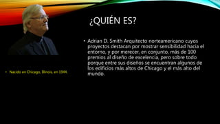 Adrian Smith es un arquitecto estadounidense conocido por diseñar algunos de los edificios más altos del mundo, incluyendo el Burj Khalifa en Dubái, el edificio más alto jamás construido con más de 820 metros de altura. El Burj Khalifa cuenta con 2957 plazas de aparcamiento, 304 hoteles y 900 apartamentos y requirió la mano de obra de miles de trabajadores durante su construcción de sólo 1.325 días. El edificio utilizó grandes cantidades de materiales como hormigón, acero y vidrio