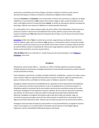 El documento resume las ideas filosóficas de varios pensadores griegos antiguos como Heráclito, Demócrito y Tales de Mileto. Heráclito creía que el fuego era la sustancia primordial y que todo está en constante cambio. Demócrito desarrolló la teoría atómica de que todo está compuesto de átomos indivisibles. Tales de Mileto fue el primer filósofo griego y creía que el agua era el principio de todas las cosas.