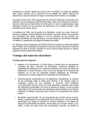 El documento define el comercio electrónico como la compra y venta de productos o servicios a través de medios electrónicos como Internet. Explica que originalmente se refería a intercambios electrónicos de datos entre empresas y ahora se refiere principalmente a la venta en línea utilizando pagos electrónicos. También describe algunas ventajas del comercio electrónico para las empresas como mejorar la distribución, comunicaciones comerciales y operaciones.
