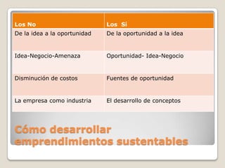 Este documento proporciona consejos sobre cómo desarrollar emprendimientos sustentables. Explica que el emprendimiento implica un crecimiento progresivo y aumentos reales en los niveles económicos. Se debe pasar de la idea a la oportunidad y enfocarse en generar valor de manera continua. El emprendimiento requiere una actitud empresarial que considere aspectos como los objetivos de gestión en distintos horizontes de tiempo, los principios a seguir como el valor y la focalización, y cómo continuar mejorando a través de un aprendiz