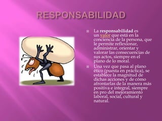 El documento describe varios valores importantes como la responsabilidad, el respeto, la puntualidad, la honestidad, la honradez, la humildad, la bondad, la integridad, la solidaridad, la decencia, la pulcritud, la coherencia, la docilidad, la sensibilidad, la compasión, el servicio, la voluntad, la paciencia y los valores en general. Define cada valor y explica su significado e importancia.