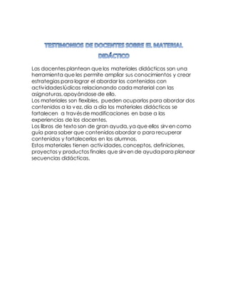 El documento discute el uso de materiales didácticos por los docentes para ampliar sus conocimientos, crear estrategias de enseñanza y abordar contenidos de manera lúdica. Los materiales son flexibles y pueden utilizarse para abordar múltiples contenidos, y se mejoran continuamente basados en la experiencia docente. Los libros de texto también son útiles como guía de contenidos y para reforzar aprendizajes en los estudiantes.