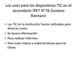 El documento describe los usos de las TIC (tecnologías de la información y comunicación) en una escuela secundaria, incluyendo buscar información, hacer informes y traer material adicional para las clases. También señala algunos problemas como dispositivos rotos y baterías con poca duración. Sugiere formas de mejorar el uso de las TIC en la escuela, como agregar enchufes, mejorar la memoria y red, y capacitar a estudiantes y personal.