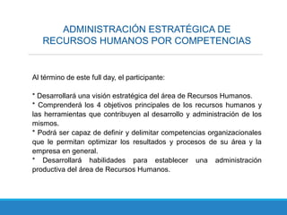 Este documento presenta los temas que se abordarán en un curso de administración estratégica de recursos humanos. El curso ayudará a los participantes a desarrollar una visión estratégica del área de recursos humanos, comprender los objetivos y herramientas de este área, definir competencias organizacionales y desarrollar habilidades para la administración productiva de recursos humanos. El curso cubrirá temas como la jerarquía de intenciones estratégicas, las áreas funcionales de recursos humanos y la