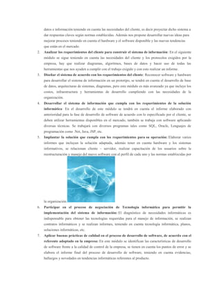 El programa Tecnologo En Analisis y Desarrollo De Sistemas de Informacion tiene como objetivo desarrollar software que cumpla con los requerimientos específicos de los clientes. Los aprendices deben tener estudios de grado once y aprobar pruebas de aptitud. El programa consta de siete módulos presenciales y tres virtuales sobre temas como análisis de requerimientos, diseño e implementación de sistemas de información, y buenas prácticas de calidad. Los aprendices pueden desempeñarse como program