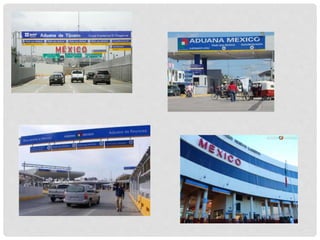 Este documento define las aduanas como lugares autorizados donde se realizan funciones de manejo y fiscalización de mercancías de comercio exterior. Explica que las aduanas tienen misiones fiscales, de seguridad, salud pública y estadística. Además, describe los tipos de aduanas como fronterizas, marítimas e interiores. Finalmente, lista las 48 aduanas de México, incluyendo sus 19 aduanas fronterizas del norte, 2 del sur, 17 marítimas y 10 interiores.