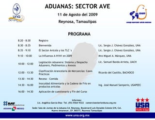 Este documento presenta el programa de un evento sobre el sector avícola que se llevará a cabo el 11 de agosto de 2009 en Reynosa, Tamaulipas. El programa incluye presentaciones sobre el impacto de los TLC en el sector avícola, la influenza A-H1N1 en 2009, la legislación aduanera mexicana, la clasificación arancelaria de mercancías avícolas y la inocuidad alimentaria en la cadena de frío de productos avícolas. El evento concluirá con la aplicación de un cuestionario