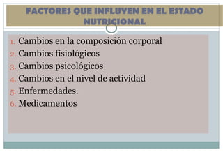 El documento resume los principales factores de riesgo y problemas de salud relacionados con la nutrición en adultos mayores, así como estrategias para evaluar y tratar la desnutrición. Describe cambios fisiológicos comunes en adultos mayores que afectan la nutrición, métodos para evaluar el estado nutricional, y formas de suplementar la dieta oral o proporcionar nutrición enteral para aquellos con dificultades para alimentarse. Recomienda evaluaciones nutricionales rutinarias de pacientes ancianos para identificar y