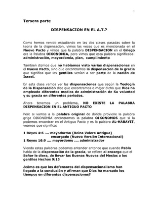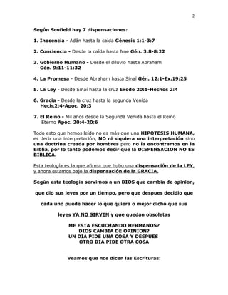 El documento discute la teoría de la dispensación, que sugiere que Dios ha administrado Su voluntad y gracia a través de diferentes períodos o "dispensaciones". Sin embargo, el documento argumenta que la noción de múltiples dispensaciones no se encuentra en la Biblia y que la palabra "dispensación" no existe en el Antiguo Testamento. También argumenta que la teoría implica que Dios cambia de opinión, lo que contradice las Escrituras. El documento concluye que la teoría de la dispensación es
