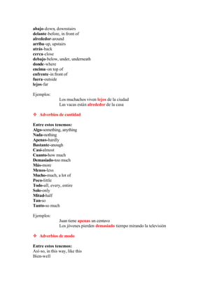 Este documento proporciona una lista y ejemplos de diferentes tipos de adverbios en español, incluyendo adverbios de tiempo, lugar, cantidad, modo, afirmación, negación y duda. Explica que los adverbios modifican verbos, adjetivos, otros adverbios y oraciones completas para especificar cuándo, dónde, cómo, cuánto o en qué grado ocurre una acción. Proporciona listas de numerosos ejemplos de adverbios comunes para cada categoría.