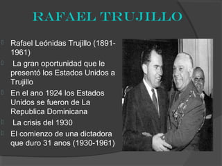 El documento resume la dictadura de 31 años de Rafael Trujillo en la República Dominicana desde 1930 hasta 1961 y sus impactos. También describe la experiencia de la escritora Julia Alvarez como una niña dominicana que se mudó a los Estados Unidos y anhelaba sentirse estadounidense. Finalmente, resume la obra "El Tiempo de la Mari" que narra la vida de la familia Mirabal y el compromiso político de tres de las hermanas para derrocar a Trujillo, lo que resultó en su asesinato.