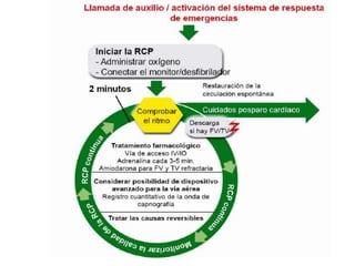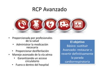 El resumen describe los componentes clave de la RCP avanzada, incluyendo: 1) Proporcionada por profesionales de la salud para administrar medicación, desfibrilación y manejo avanzado de la vía aérea; 2) Incluye procedimientos básicos como compresiones torácicas y ventilación, así como técnicas médicas avanzadas e invasivas; 3) El objetivo es restaurar o revertir definitivamente la parada cardiorrespiratoria mediante la identificación y tratamiento de causas reversibles.