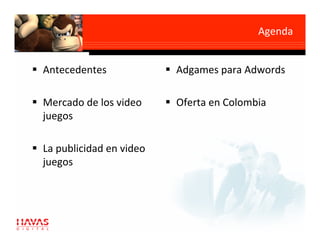 Este documento presenta los antecedentes históricos de los videojuegos desde 1958 hasta la actualidad, destacando hitos como Pong, Pac-Man y Nintendo NES. Luego describe el crecimiento del mercado de los videojuegos y el perfil típico del jugador, señalando que la mayoría son hombres entre 18 y 35 años. Finalmente, analiza las actividades más comunes que realizan los usuarios de diferentes edades en Internet, donde jugar videojuegos es más frecuente entre los más jóvenes.