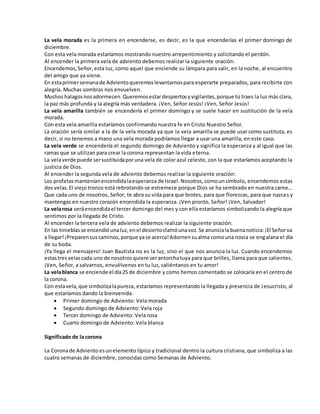 El Adviento es el comienzo del año litúrgico cristiano que se celebra en las cuatro semanas antes de Navidad. Es un tiempo de preparación espiritual para la venida de Jesucristo, representado por el encendido progresivo de cuatro velas morada, verde, rosa y blanca en la corona de Adviento. Cada color tiene un significado relacionado con la fe, la esperanza, la alegría y la llegada de Cristo.