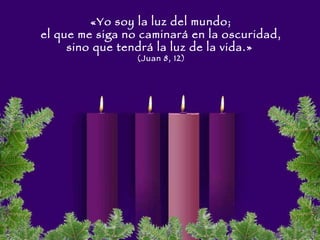 Este documento presenta un resumen de las cuatro semanas del Adviento. La primera semana es una llamada a estar vigilantes y esperar al Señor con alegría. La segunda semana enfatiza mantener encendida la esperanza como los profetas. La tercera semana es un tiempo de gozo para preparar nuestra alma como una novia. La cuarta semana conmemora el nacimiento de Jesús en un pesebre y la fe, esperanza y caridad de la Virgen y San José.