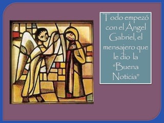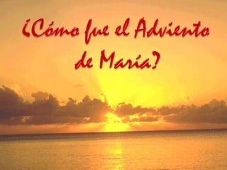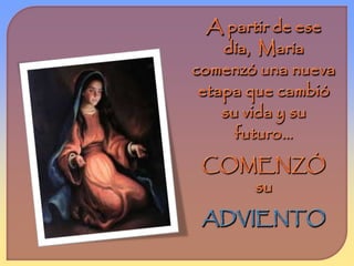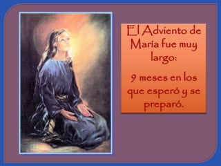 El documento describe el adviento de María como uno de oración, lleno de problemas difíciles pero confiando en Dios, sirviendo alegremente a los demás y esperando con ilusión el nacimiento de Jesús.