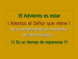 El documento habla sobre el significado del Adviento como un tiempo de esperanza y preparación para la venida de Jesús. Se enfatiza que es un periodo para despertar de la apatía y cambiar el corazón, convirtiéndose para recibir a Jesús que ya viene a salvarnos y purificarnos. El Adviento invita a los cristianos a trabajar por un mundo mejor y amar a los necesitados en espera del regreso definitivo de Cristo.