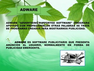 Este documento habla sobre el adware, que son programas que muestran publicidad a los usuarios. Explica que el adware se instala a través de sitios web, software gratuito y en ocasiones software comercial legítimo. También controla la navegación del usuario para mostrar publicidad personalizada basada en la búsqueda actual y el historial del usuario. Algunos síntomas de tener adware incluyen ventanas emergentes pop-up y la adición de enlaces en los favoritos. El documento concluye explicando que estos programas invaden los sist