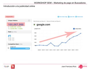 El documento presenta una introducción al marketing de pago en buscadores, definiendo términos como SERP, SEO, SEM y SMM. Explica conceptos como publicidad en internet, CPM, impresiones publicitarias, CPC y CPA. También describe el servicio Google AdWords y ofrece consejos para la creación y optimización de campañas y anuncios.