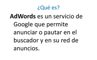 AdWords es un servicio de Google que permite a los usuarios crear anuncios utilizando palabras clave relacionadas con su negocio. Estos anuncios aparecen junto a los resultados de búsqueda de Google cuando alguien realiza una búsqueda con esas palabras clave. Los anunciantes solo pagan cuando los usuarios hacen clic en sus anuncios. AdWords ofrece flexibilidad para modificar los anuncios y ajustar el presupuesto para lograr los resultados deseados.