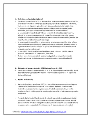 La Corporación Universitaria Minuto de Dios se enfoca en la responsabilidad social universitaria (RSU) mediante programas como "El ingeniero del barrio" que ayuda a las comunidades, y las prácticas de los estudiantes en fundaciones. El Centro de Desarrollo (CED) tiene como objetivo mejorar la calidad de vida de las comunidades vulnerables a través de servicios comunitarios y proyectos de alfabetización. La universidad también ofrece educación flexible y apoyo financiero para que los estudiantes puedan acceder a una educación superior