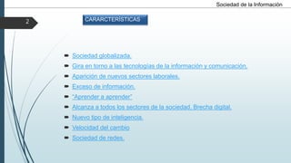 La sociedad de la información se caracteriza por estar globalizada y girar en torno a las tecnologías de la información, lo que ha dado lugar a nuevos sectores laborales y un exceso de información disponible. Abarca todos los sectores de la sociedad pero también ha creado una brecha digital.