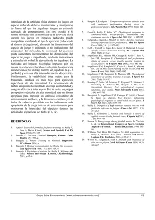 El documento discute el uso de partidos de fútbol en espacios reducidos para mejorar la aptitud aeróbica de los futbolistas. Se ha reportado que una alta aptitud aeróbica ayuda en la recuperación durante actividades intermitentes de alta intensidad propias del fútbol. Los juegos en espacios reducidos son comúnmente usados por entrenadores para entrenamiento, y estudios recientes sugieren que pueden ser efectivos para mejorar la aptitud aeróbica si la intensidad es monitoreada y manipulada para proveer