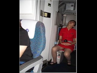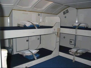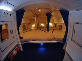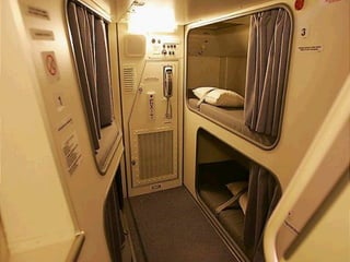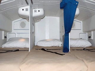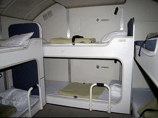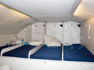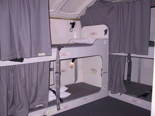 Las aeromozas duermen en literas estrechas ubicadas en la parte trasera del avión. Algunas aerolíneas como KLM, Airbus y Boeing usan aviones como el 747-400, A340 y 777, donde las aeromozas descansan en literas estrechas. Otras aerolíneas como Singapore Airlines proveen TV e internet a bordo para que las aeromozas se relajen durante los vuelos.
