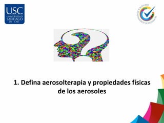 Este documento describe diferentes aspectos de la terapia respiratoria por aerosol. Define aerosolterapia como la administración de medicamentos por vía inhalada o nebulizada de partículas al tracto respiratorio con fines terapéuticos. Explica las propiedades físicas de los aerosoles como estabilidad, penetración y depósito, y cómo estos dependen del tamaño de partícula. También describe las diferencias entre terapia inhalada y nebulizada, así como las indicaciones y contraindicaciones de cada una. Finalmente,
