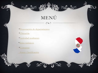 Este documento presenta información sobre la ciudad de Asunción, la capital de Paraguay. Proporciona detalles sobre la ubicación de Asunción, sus principales actividades y sitios turísticos como el Casco Antiguo, museos y la Catedral. También incluye contactos para obtener más información turística sobre la ciudad. El autor justifica la elección de Asunción porque es la ciudad que más ama en Paraguay y donde tiene la suerte de vivir.