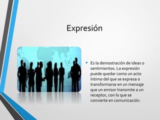 Este documento describe diferentes formas y funciones de la expresión oral y escrita. Explica que la expresión puede ser un acto íntimo o convertirse en comunicación cuando se transmite un mensaje. Luego detalla varios tipos de expresión como artística, literaria, poética y corporal. También cubre formas lingüísticas como descripción, narración, argumentación y exposición. Por último, ofrece actividades y didácticas para mejorar la expresión oral y escrita en los estudiantes.