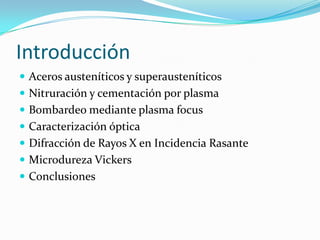Este documento presenta un estudio sobre el tratamiento de nitruración y cementación por plasma en aceros austeníticos y superausteníticos. Se caracterizaron las muestras tratadas mediante microscopía óptica y de rayos X, observando la formación de una capa endurecida. Las muestras también fueron bombardeadas con iones de deuterio o helio utilizando un dispositivo plasma focus, lo que redujo la expansión de la red cristalina. La dureza superficial disminuyó con el número de disparos.