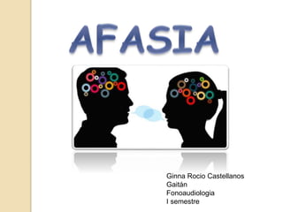 La afasia es una incapacidad parcial o total para usar el lenguaje causada por una lesión en el cerebro. Puede causar problemas con la expresión, comprensión, lectura y escritura. Existen diferentes tipos de afasia dependiendo de si hay problemas de expresión, comprensión o ambos. Los tests de Token y de Aachen son usados para diagnosticar el tipo de afasia. El tratamiento lo realiza un logopeda y consiste en ejercicios de repetición, construcción de oraciones y aplicación de las habilidades comunicativas en la vida diaria.